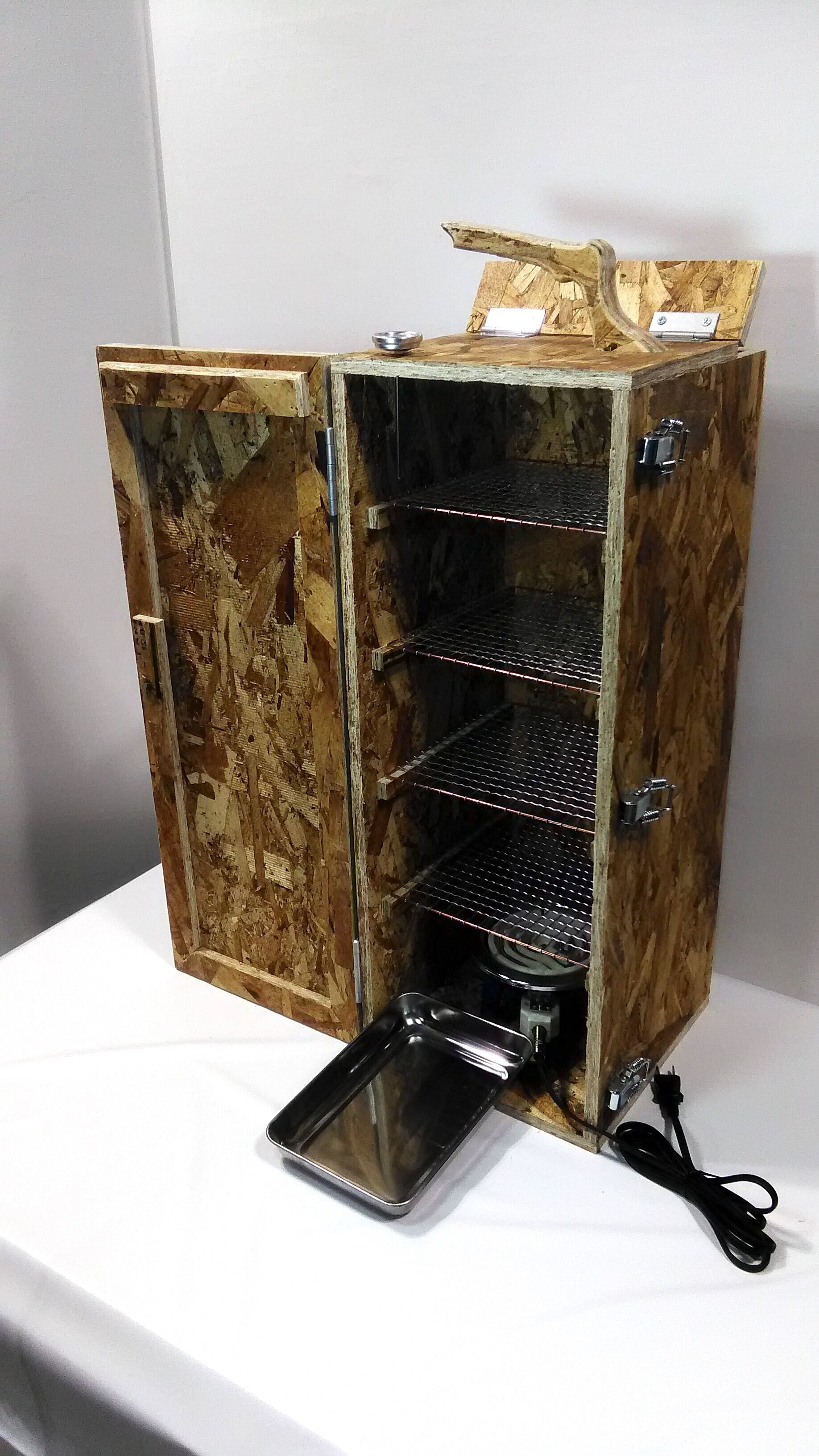 内容物:木製燻製器本体、300W電熱器、20cm角網4枚、スモーカー用温度計、約21cm×14cmトレー、さくらスモークウッド1回分